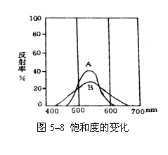 在顏色檢測中物體色的飽和度取決於物體本身表麵的選擇性反射光的輻射能力。物體對光譜某一較窄波段的反射率高,而對其它波長的反射率很低或沒有反射,則表明它有很高的選擇性反射的能力,這一顏色的飽和度就高。如下圖所示,分光反射率曲線A比曲線B顯示的顏色飽和度高。